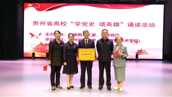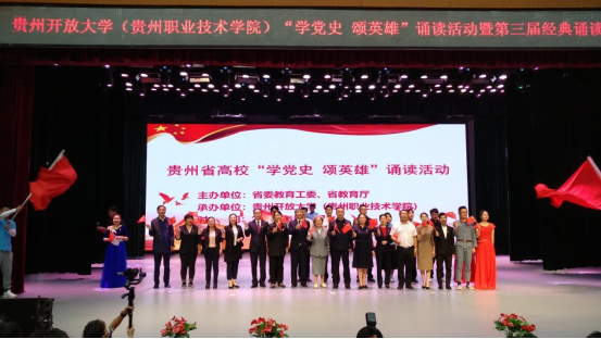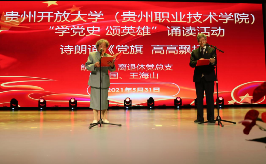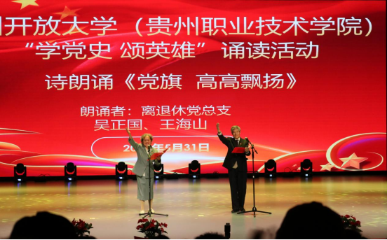 在喜迎建党100周年之际,5月31日,由省委教育工委、省教育厅主办、贵州开放大学(贵州职业技术学院)承办的“贵州省高校‘学党史 颂英雄’诵读活动暨第三届经典诵读大赛”在学校大礼堂隆重举行。来自各二级学院、机关党委、八鸽岩党总支、成开院等部门师生代表精心编排的共15个节目参加了本次比赛。离退休党总支委员,离退休第五、第六支部支部书记吴正国、王海山表演的诗朗诵《党旗 高高飘扬》作为特邀节目拉开了活动的序幕。