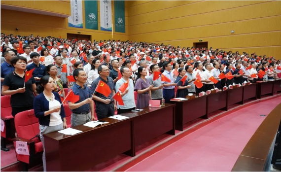 会议最后,离退休党员老同志们和全校师生一起挥舞着五星红旗高声合唱《没有共产党就没有新中国》,党史专题党课会议在歌声中结束。