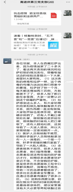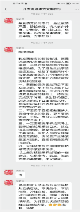 9月刚至,疫情肆虐,我们美丽的家园---贵阳市遭遇了有史以来的最严重的新冠瘟疫传播,奥密克戎病毒正在悄无声息地残害和威胁着我们身边的每一个人。9月3日,在党和政府的正确领导下,贵阳市每一个市区都进入了疫情防控静默期。9月5日,学校党委发出了《抗击疫情 党员先行,让党旗在疫情防控一线高高飘扬---致全校各级党组织和全体党员的一封信》,要求我们每一名党员扛起责任,强化担当,服从指挥,自觉遵守疫情防控纪律,充分发挥党员模范表率作用,离退休党总支全体党员干部纷纷响应,积极抗击疫情。