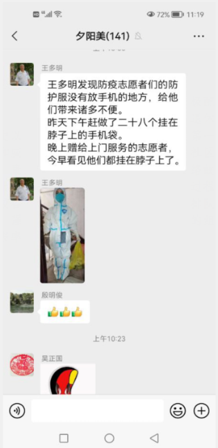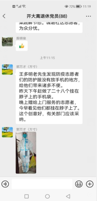 抗击疫情、离退休党总支第一党支部党员先行。近80岁的一支部党员老同志王多明发现社区防疫志愿者们的防护服没有放手机的地方,给他们带来诸多不便,就赶做了二十八个挂在脖子上的手机袋赠送给上门服务的志愿者,第二天就看见他们挂在脖子上。老党员王多明同志不顾年高体弱,以实际行动站在了疫情防控第一线,彰显了共产党员不畏艰难抗击疫情的高尚品质。