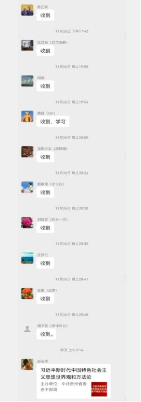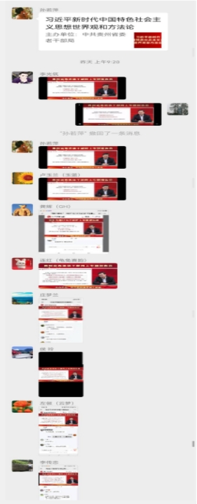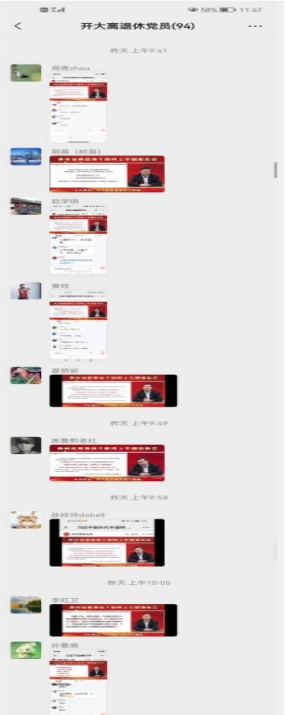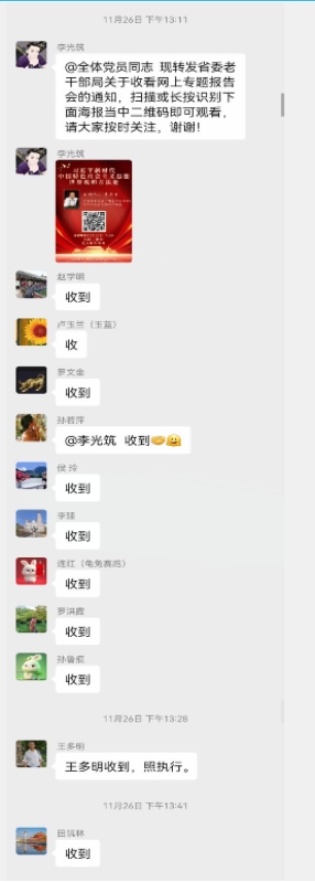 11月27日上午,专题讲座开始后,离退休党委党员老同志们积极认真地收听收看,并将自己收看专题讲座截图发在党员微信群里展示自己学习情况,并进行学习交流讨论。