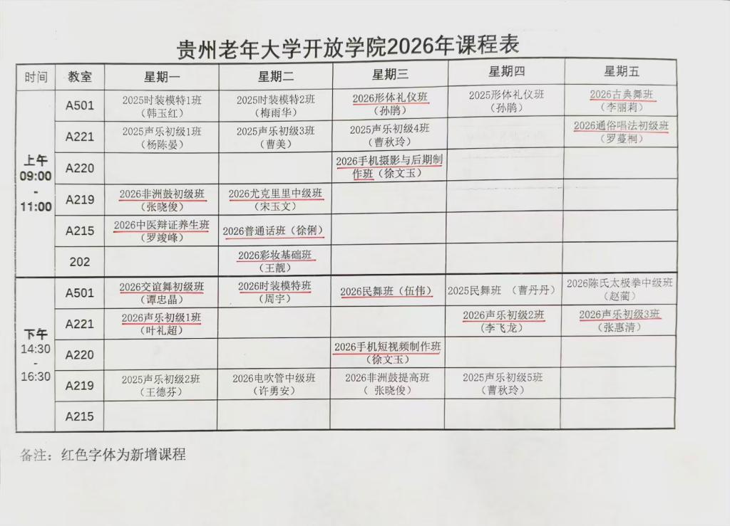 各位尊敬的老同志,贵州老年大学开放学院2026年招生现已开始,有意向参加学习的老师可参考以下课程表进行报名,具体事项请咨询联系人:李光筑,联系电话:13984****688 报名截止时间:2025年12月30日