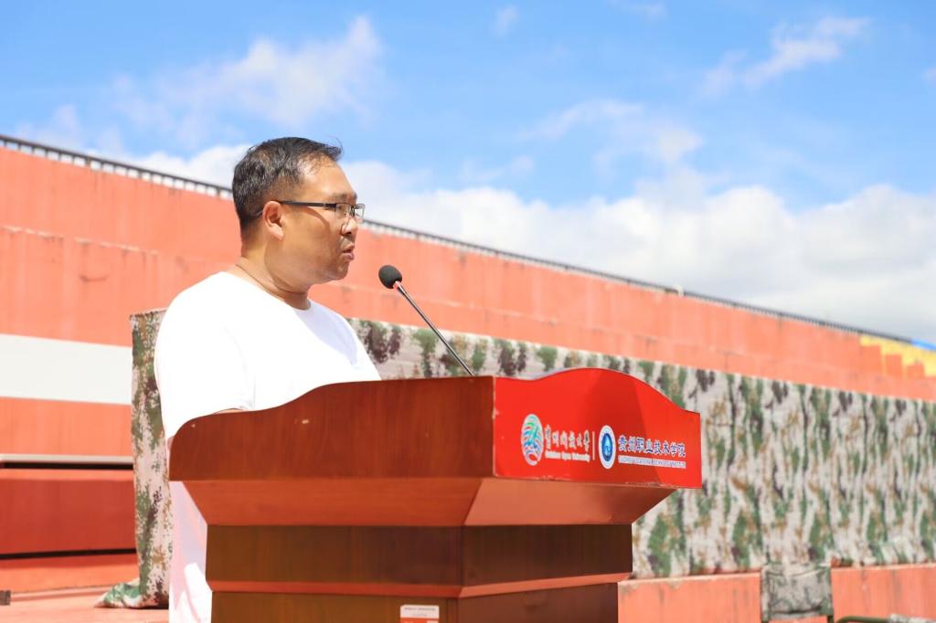 信息工程学院关工委主任姚楠作为二级学院关工委代表讲话,他说,今天是全民国防教育日,“9·18”警钟每年都会敲响,这也是引领中华儿女奋进新征程的号角,希望同学们珍惜军训机会,练就强健体魄,塑造坚毅品格,铸就坚定地爱国拥军意识,铭记历史,自强不息,为中华民族伟大复兴贡献青春力量。